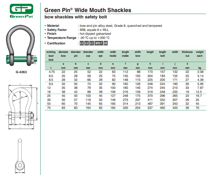 Green Pin BigMouth? 弓形卸扣BN是一種8級卸扣,帶有安全螺栓和更寬的卸扣口。更寬的卸扣口使您能夠?qū)⑿犊圻B接到比普通更寬的連接點(例如墊眼)上。該卸扣還提供雙重安全(開口銷和安全螺栓),防止銷子意外松開。由于Green Pin BigMouth? 弓形卸扣BN的鍍鋅處理,確保了長期的耐用性。當然,Green Pin BigMouth? 弓形卸扣BN符合多種認證。該卸扣適用于單腿和多腿系統(tǒng),工作負荷限制從4.75到75噸。